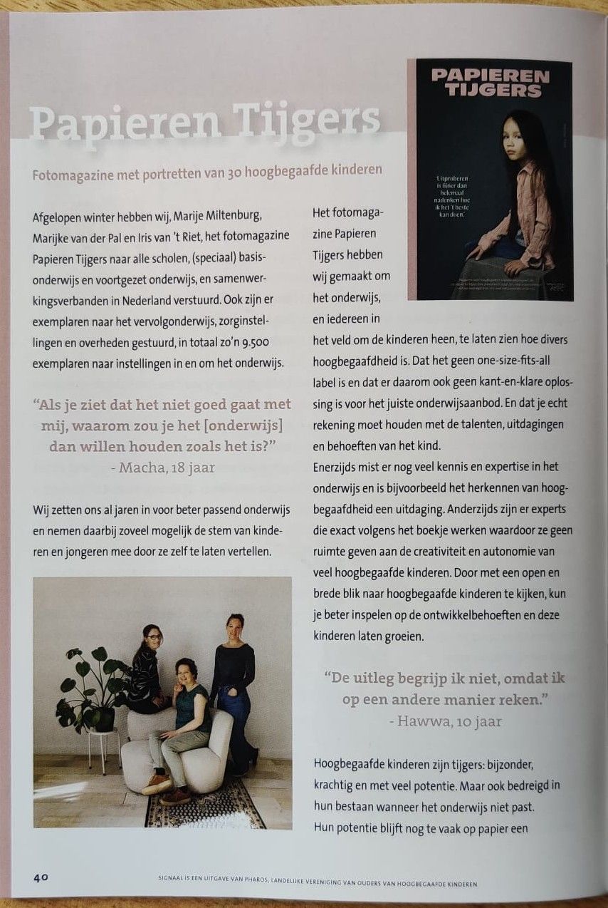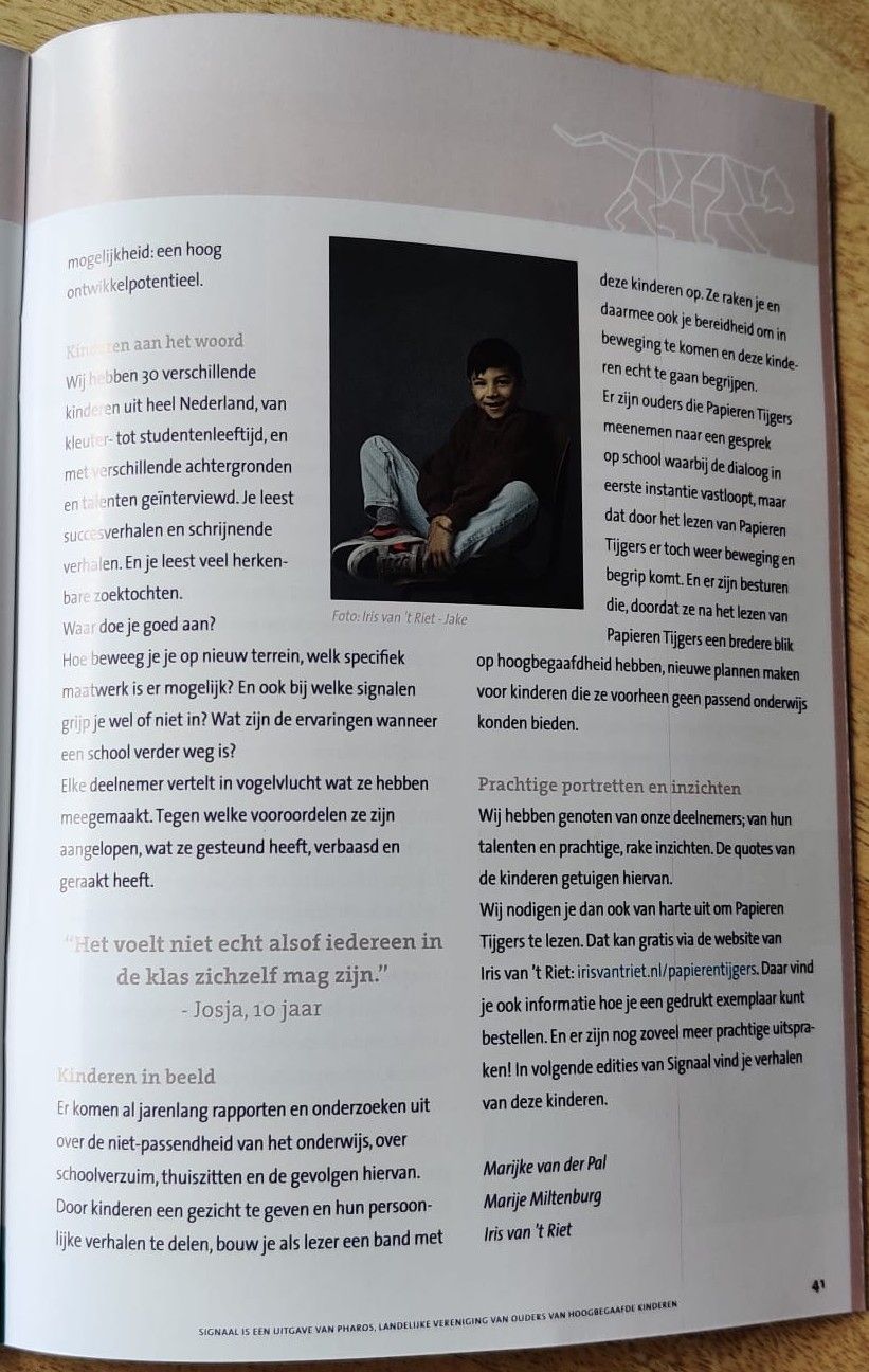 We hebben een leuke samenwerking met ledenblad Signaal. Het blad voor leden van oudervereniging Pharos, een vereniging voor ouders van hoogbegaafde kinderen.